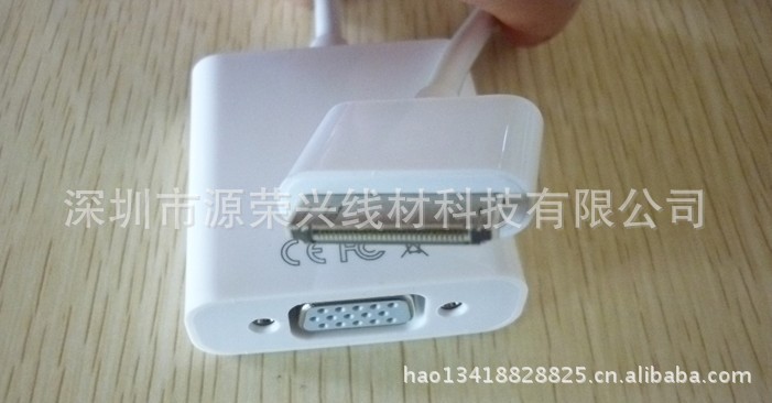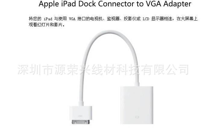 深圳市源荣兴线材科技有限公司是一家主要从事计算机和通信网络周边线缆.专业生产:MINIDP线 苹果数据线、USB3.0线 音频线 视频线、HDMI线 高清线 3D网络线、DVI线USB线 1394线.HDMI/DVI线 HDMI/VGA线. 充电线、苹果.HTC.三星手机数据线. VGA线 信号线、串口线 并口线 打印线、电脑周边线材、多芯数据信号线缆.连接器等产品. 订做各种特殊线缆,承接OEM线缆订单!产品介绍品名:iPad 1 2 iPhone 4 4s Touch 4 VGA 视频/投影仪/连接线 转接颜色:白色长度:0.15mDock连接器转VGA线,有了这跟线,您就可以将苹果产品的的视频信号转到VGA投影仪,或者VGA液晶电视上了