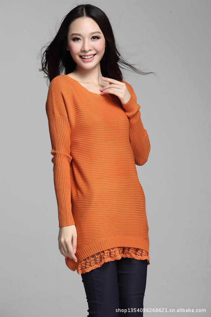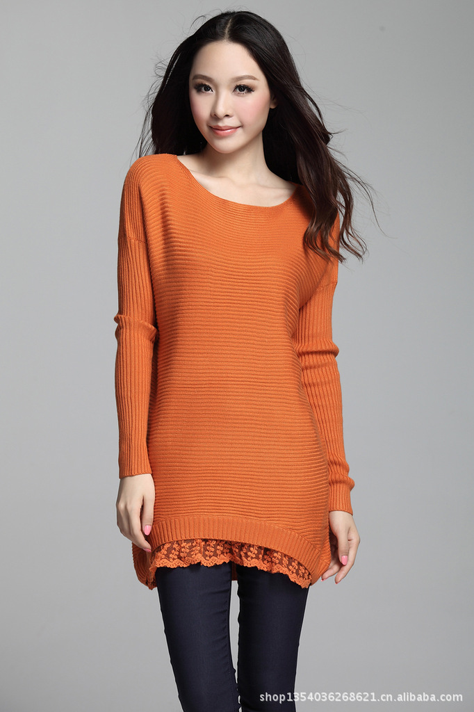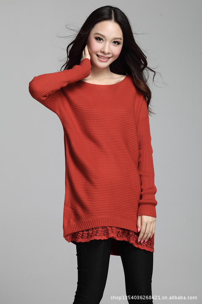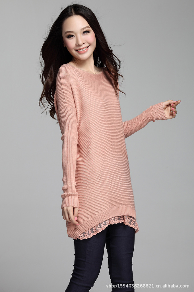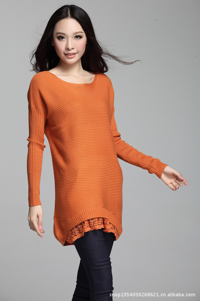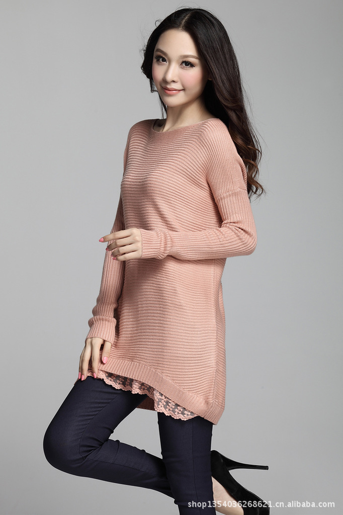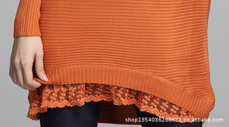 冬装热销女装毛衣 时尚韩版蕾丝下摆女式宽松 中长款毛衣68020