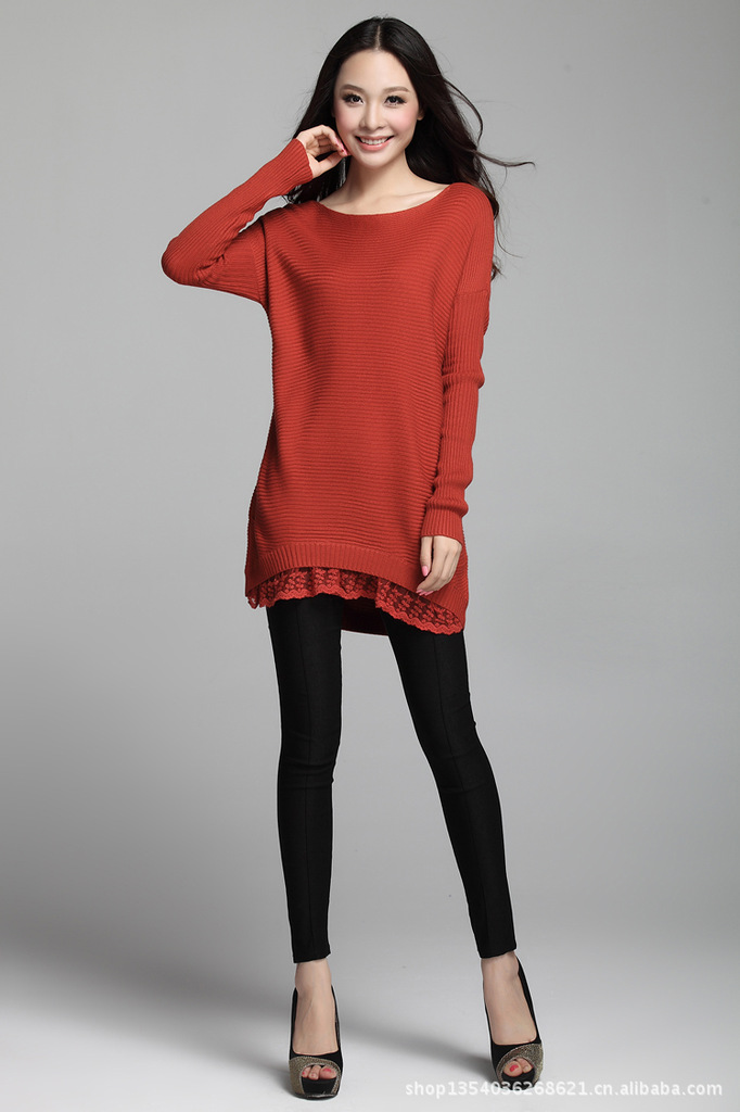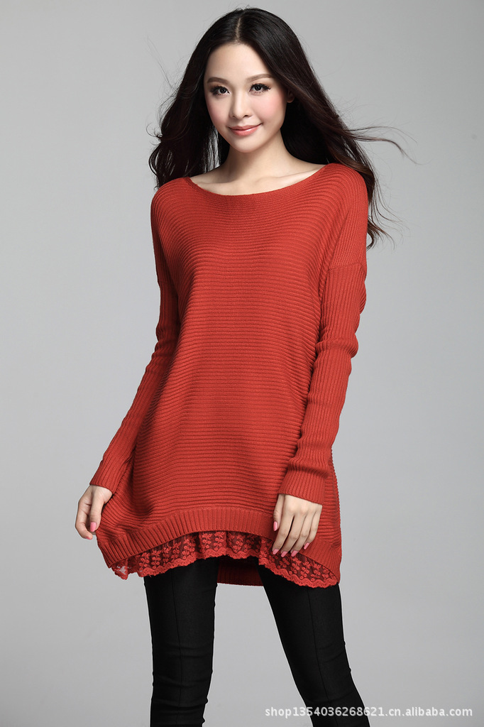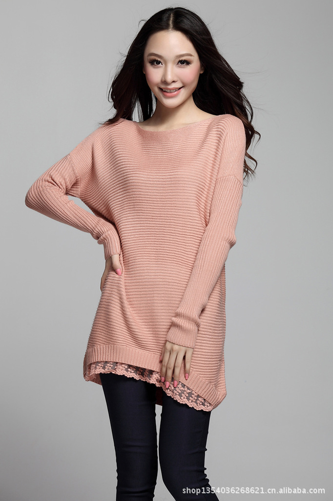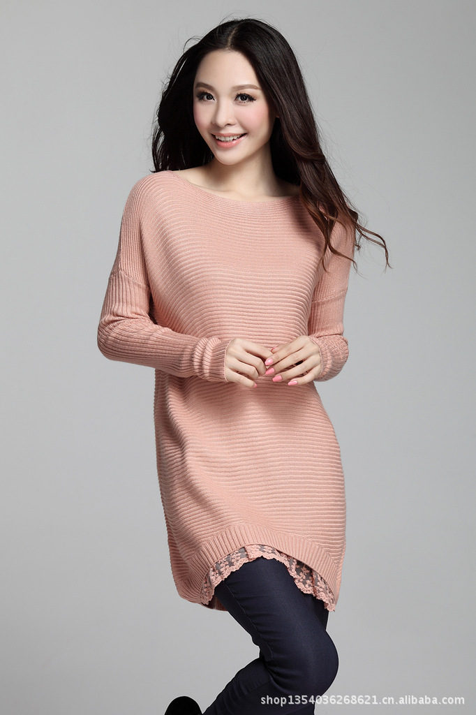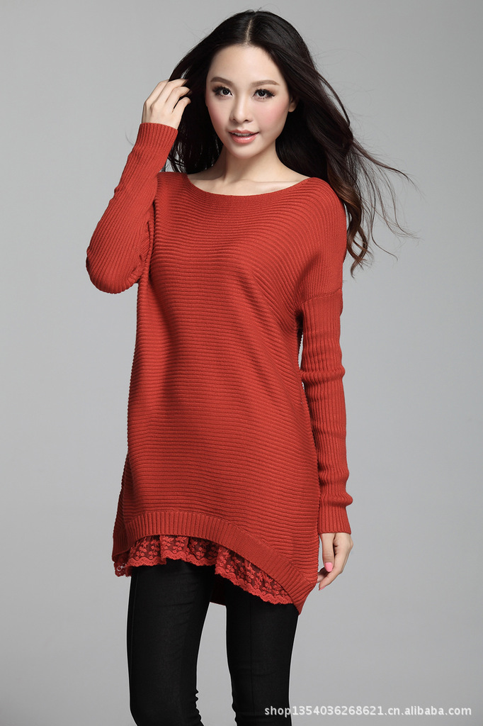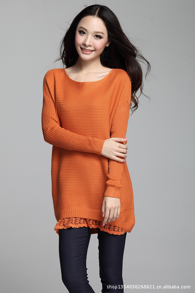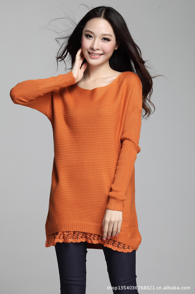 冬装热销女装毛衣 时尚韩版蕾丝下摆女式宽松 中长款毛衣68020