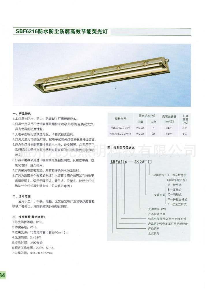 5、SBF6216防水防尘防腐荧光灯本产品抗强酸、强碱、盐、氨、氯离子腐蚀,防水、防尘、防腐等级为F2,防护等级为IP66。