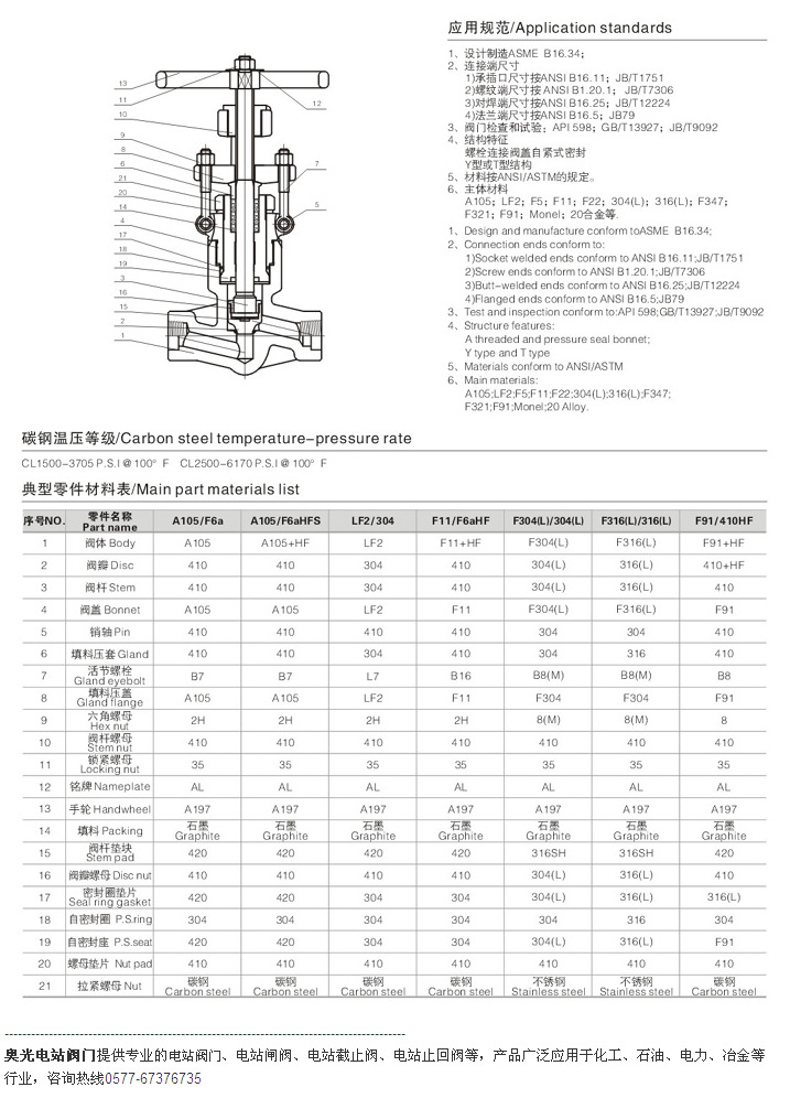 浙江奥光阀门有限公司集阀门产品研制开发、设计、生产、销售为一体的专业的企业是中国阀门协会成员,公司已 通过了ISO9001、国家压力管道制造许可证、中国电力公司电站配件供应网络成员、中国华电集团招标与采购集团公司供应商会员等企业称号。公司经历了多年的不断发展和创新,现有高级工程师及熟练技术员工200多人,公司厂房占地面 积15600平方米,拥有各种精良机械加工及专用设备,设有CAD阀门处理中心、材料化学分析中心、布洛维硬度测试、光谱分析,金相分析、机械性能试验、X,丫射线探伤、磁粉探伤、着色探伤、超声波探伤,等离子喷焊等。