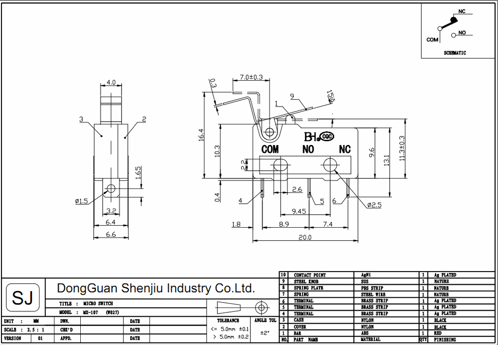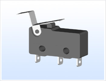 此款为高寿命、高品质、微动开关Micro Switch、压接微动、三脚带弯柄行程微动开关MX-107