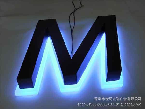 不锈钢背发光字:顾名思义,不锈钢背面发光。不锈钢字一般采用201#或304#不锈钢材料,有镜面的和拉丝的,厚度一般在5CM左右,内置高质量防水LED灯(室外),室内的一般用不防水的,灯光均匀,鲜明照在背板上名是墙面上,一般多用于LOGO墙,标识,字都是小型的,室内居多,一般大型的不采用此种做法,主要是因为灯置在后面,不封闭。12V变压器,背部离墙大约3cm离墙安装,适用范围:店招,企事业单位六面及楼顶发光字。