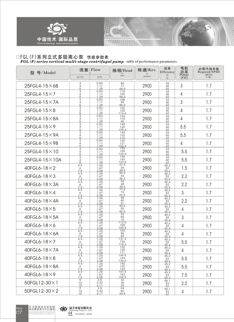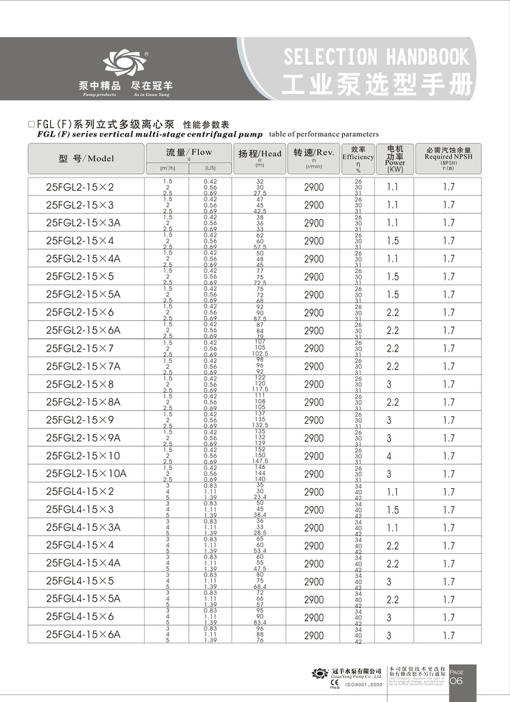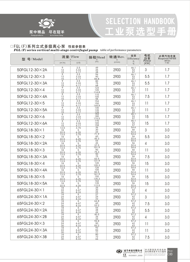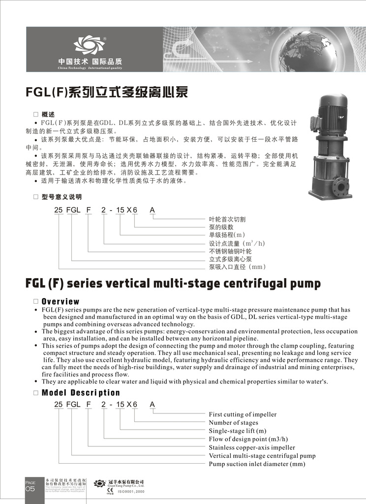 FGL(F)系列立式多级离心泵 型号:25FGL2-15*2~150FGL150-30*6A 产品概述: FGL(F)系列泵是本公司根据市场需求,在我公司产品GDL、DL系列立式多级泵的基础上、结合国外先进技术、优化设计制造的新一代立式多级稳压泵。 该系列泵最大的优点是:节能环保,占地,面积小,安装方便,可以安装于任一段水平管路中间。 该系列泵采用泵与电机通过夹壳联轴器联接的设计,结构紧凑,运转平稳;全部使用机械密封封,无泄漏,使用寿命长;选用优秀水力模型,水力效率高、性能范围广。 完全能满足高层建筑、工矿企业的给水、消防设施及工艺流程需要。适用于输送清水和物理化学性质类似于水的液体。 应用范围: □高层建筑及住宅群的供水; □消防喷淋系统供水、尤其适合高层建筑分区分压消防供水; □市政供水及增压; □工厂供水及生活供水; □空调、采暖、冷却水循环; □锅炉给水及冷凝系统给水; 使用条件: 1、 电源:三相、 380V、 50Hz; 2、介质温度一般不超过80°C,PH值5-9,介质重度≤1050kg/m³; 3、环境温度:≤40°C,相对湿度不超过95%; 4、泵工作环境应无粉尘及可燃性气体; 当对流量、扬程、进口压力、电机电压、频率、防爆等有特殊要求时,请在合同中注明。 性能范围 □转速:2900r/min □流量范围:2~150m³/h □扬程范围:30~160m □最大出口压力:≤1.6MPa |