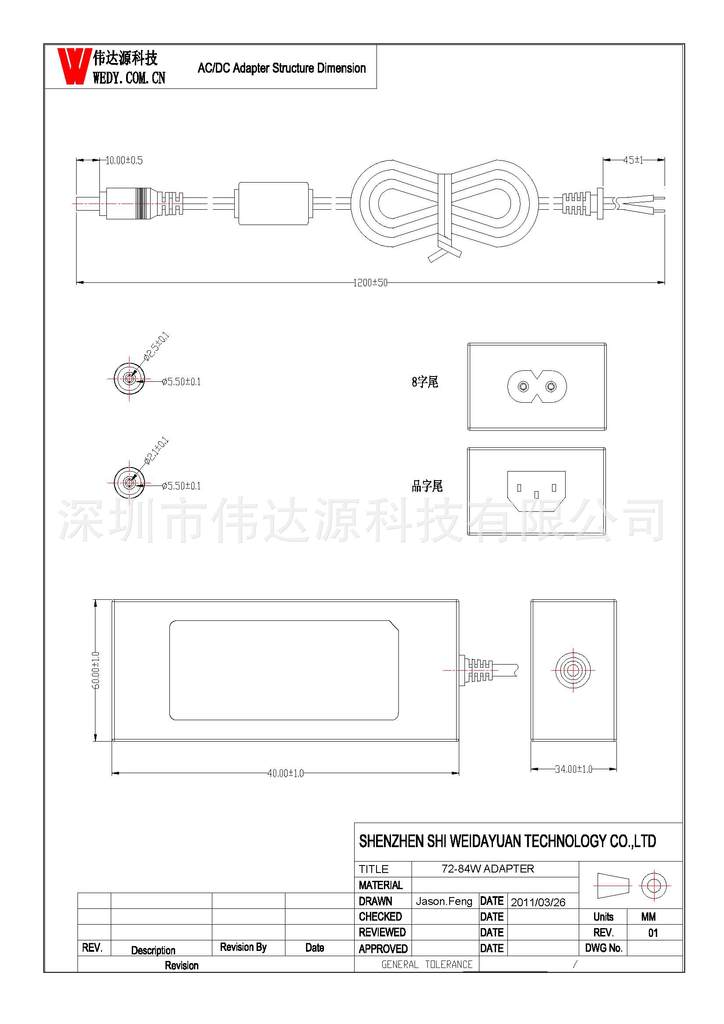 DC线: AWM 1185 18AWG*2C,VW-1,80℃,FTI,300V,线上有字,总1.2米,带环加5.5*2.5公头