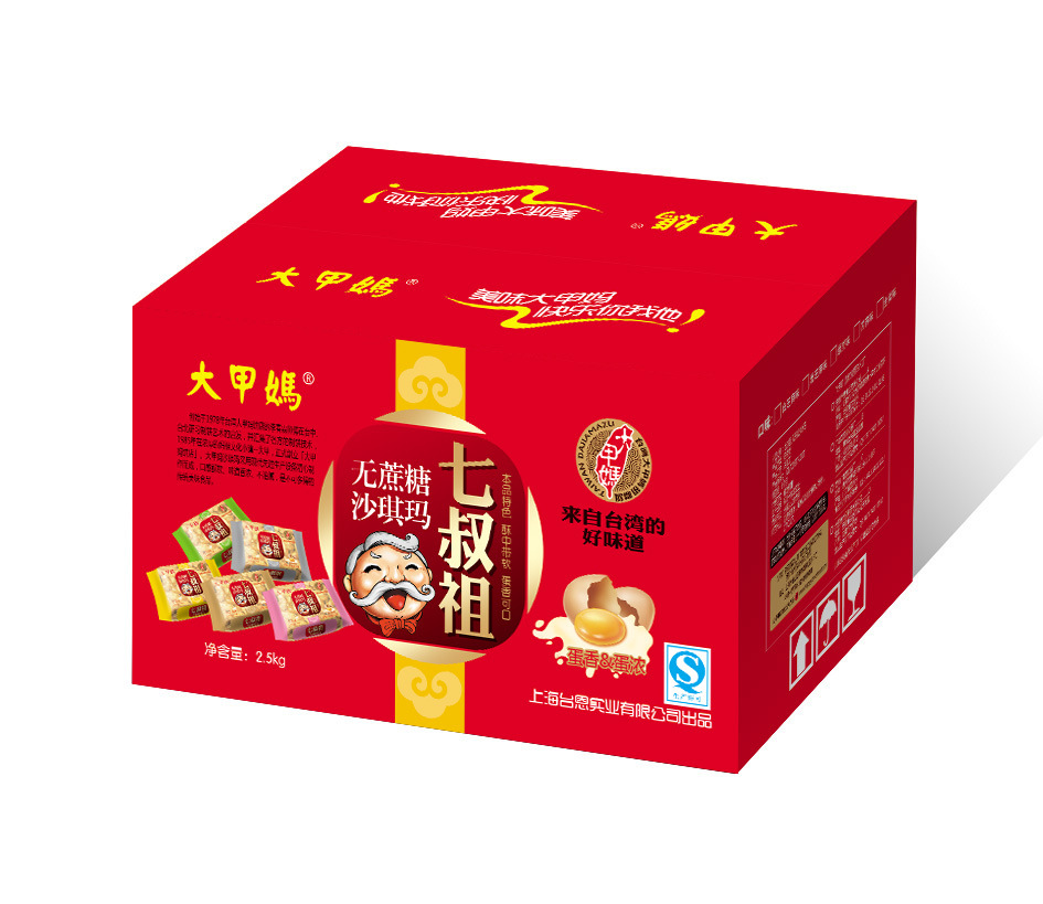 2013年台恩实业推广的来自台湾的文化品牌“大甲妈”, 最新推出无蔗糖沙琪玛“七叔祖”系列,共五个口味,全蛋味、黑芝麻味、苦荞味、绿豆味、白芝麻味,每箱重2.5kg