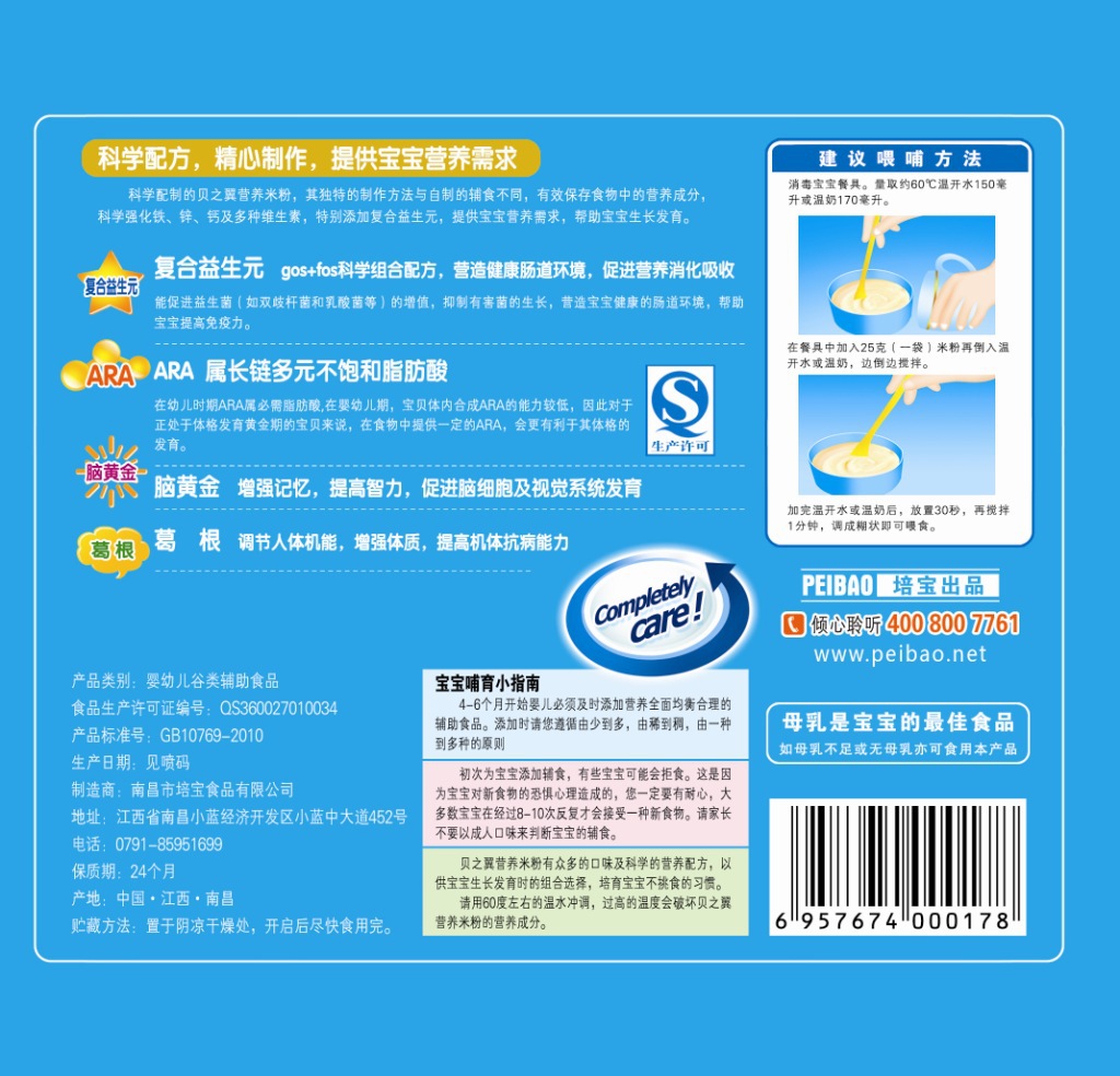 培宝食品旗下品牌的贝之翼米粉是以大米为主要原料,采用优质江南贡米、胚芽米。特别添加进口益生元(FOS+GOS)、乳清蛋白、DHA、ARA,无水葡萄糖、江南草本特产,采用CHE技术精制而成。产品冲调前,闻着不香,冲调后,散发米香,口感细腻润滑,易吸收、不上火。绝不添加任何香精、色素、防腐剂、蔗糖。