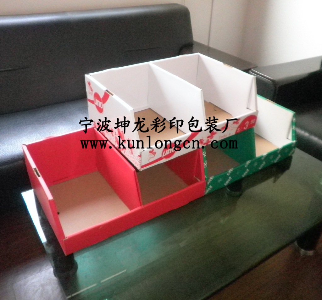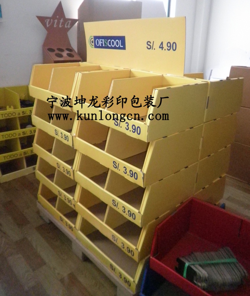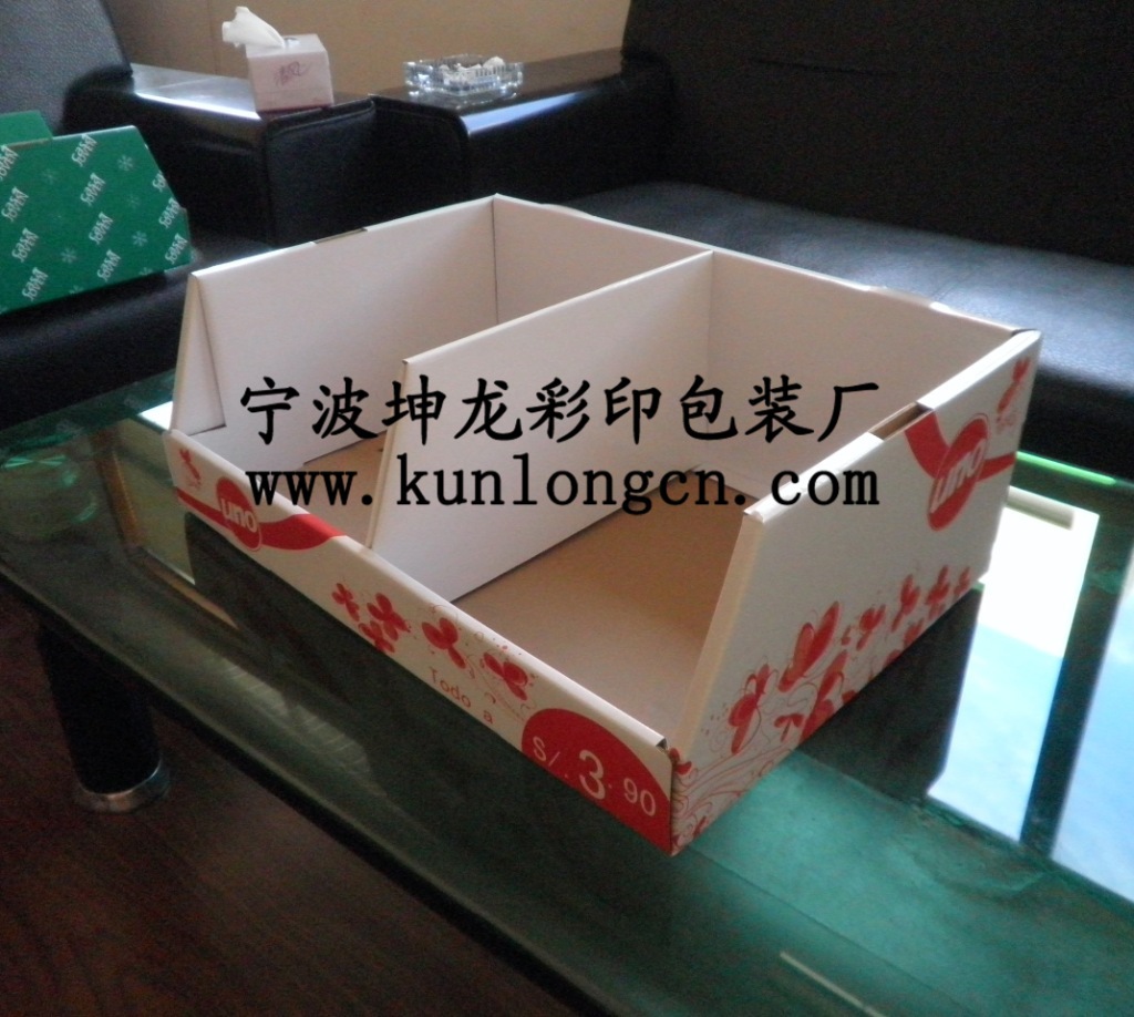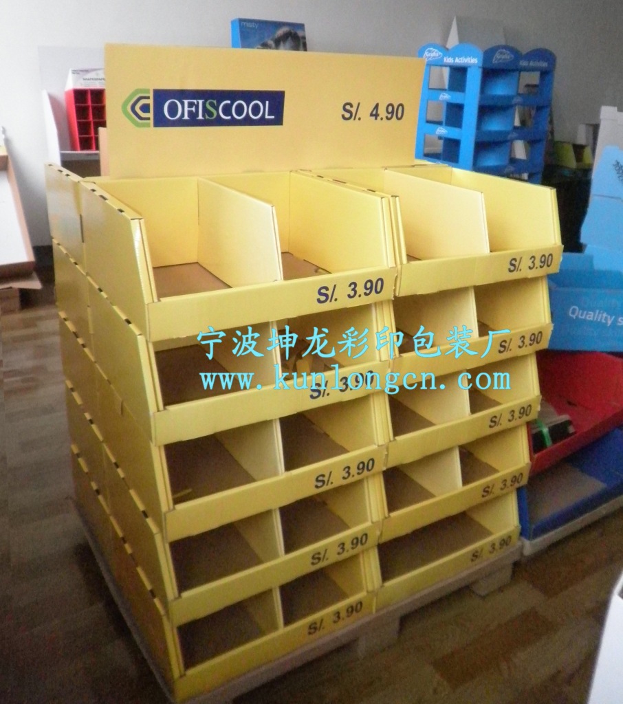 宁波坤龙彩印包装有限公司是一家从事纸品展示架、纸展示制品的专业设计和研发生产的企业。目前我们的纸货架包含PDQ、隔板展示架、展示台、堆头、彩箱、托盘展架、桌面展架、架卡展架、梯式展架、展示盒、陈列架、橱柜式展示架、欢迎牌、挂钩展架、宠物房等等。