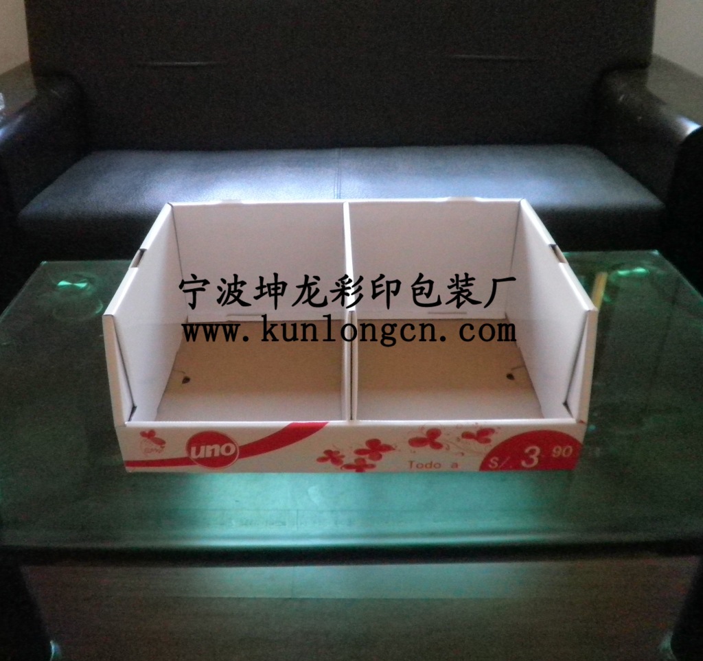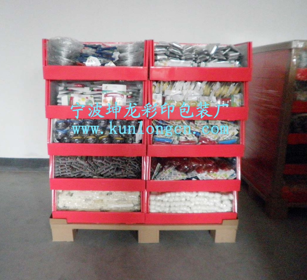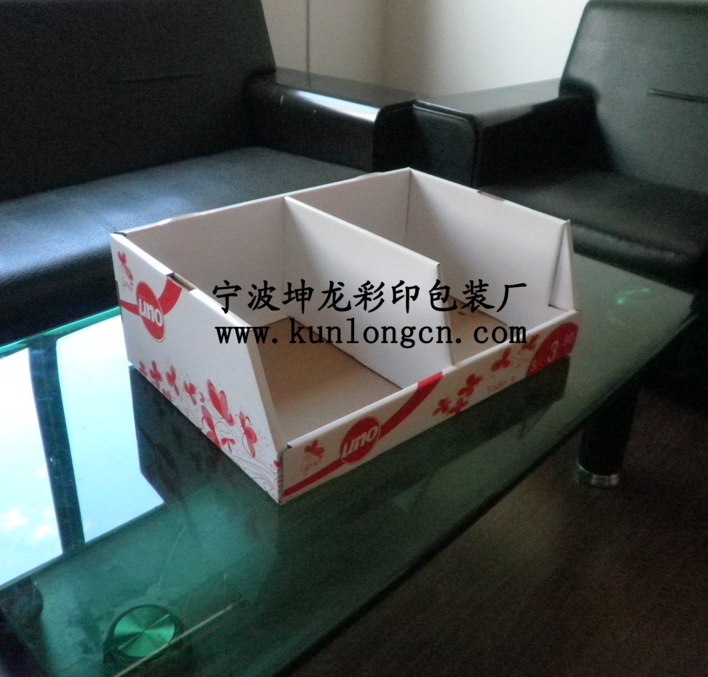 宁波坤龙彩印包装有限公司是一家从事纸品展示架、纸展示制品的专业设计和研发生产的企业。目前我们的纸货架包含PDQ、隔板展示架、展示台、堆头、彩箱、托盘展架、桌面展架、架卡展架、梯式展架、展示盒、陈列架、橱柜式展示架、欢迎牌、挂钩展架、宠物房等等。
