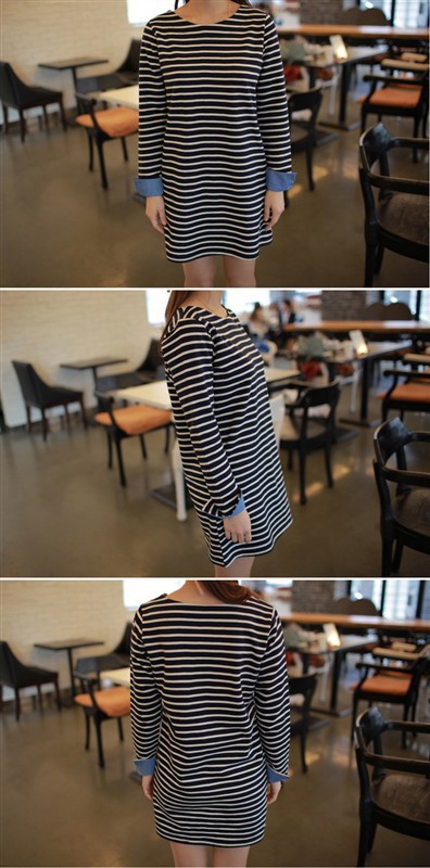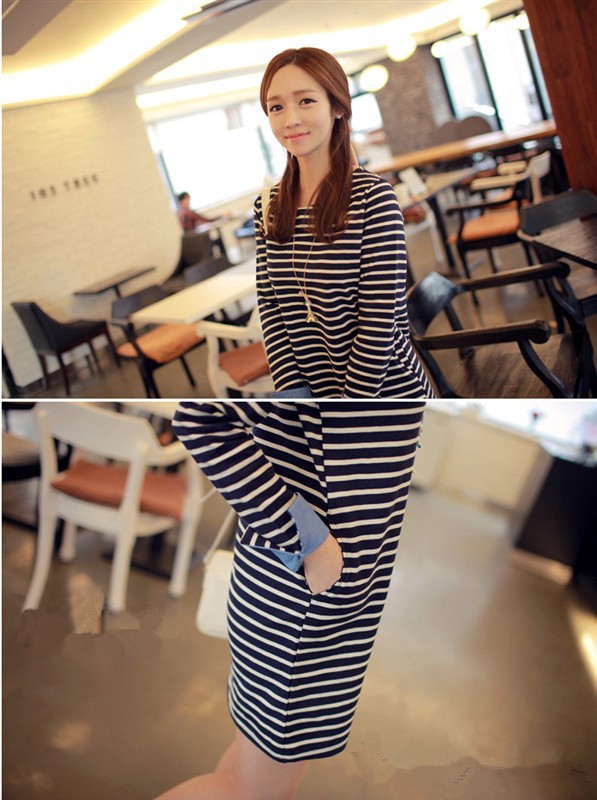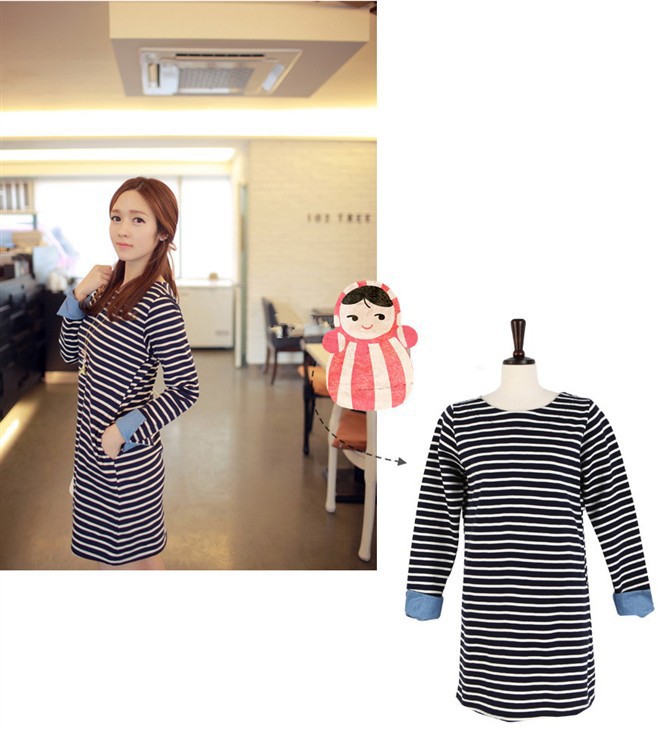 韩国女装秋冬新款海军条纹挽袖拼色宽松长T连衣裙FE242