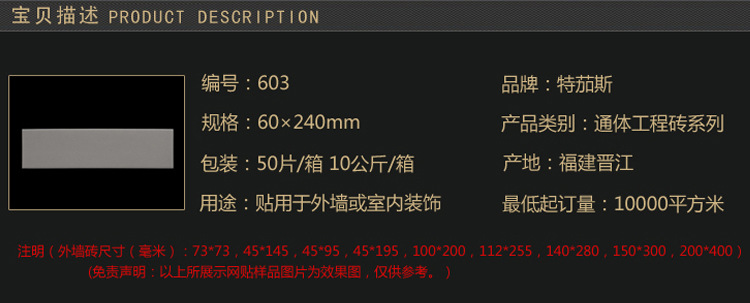 外墙砖尺寸(毫米):73*73,45*145,45*95,45*195,60*240,100*200,112*255,140*280,150*300,200*400