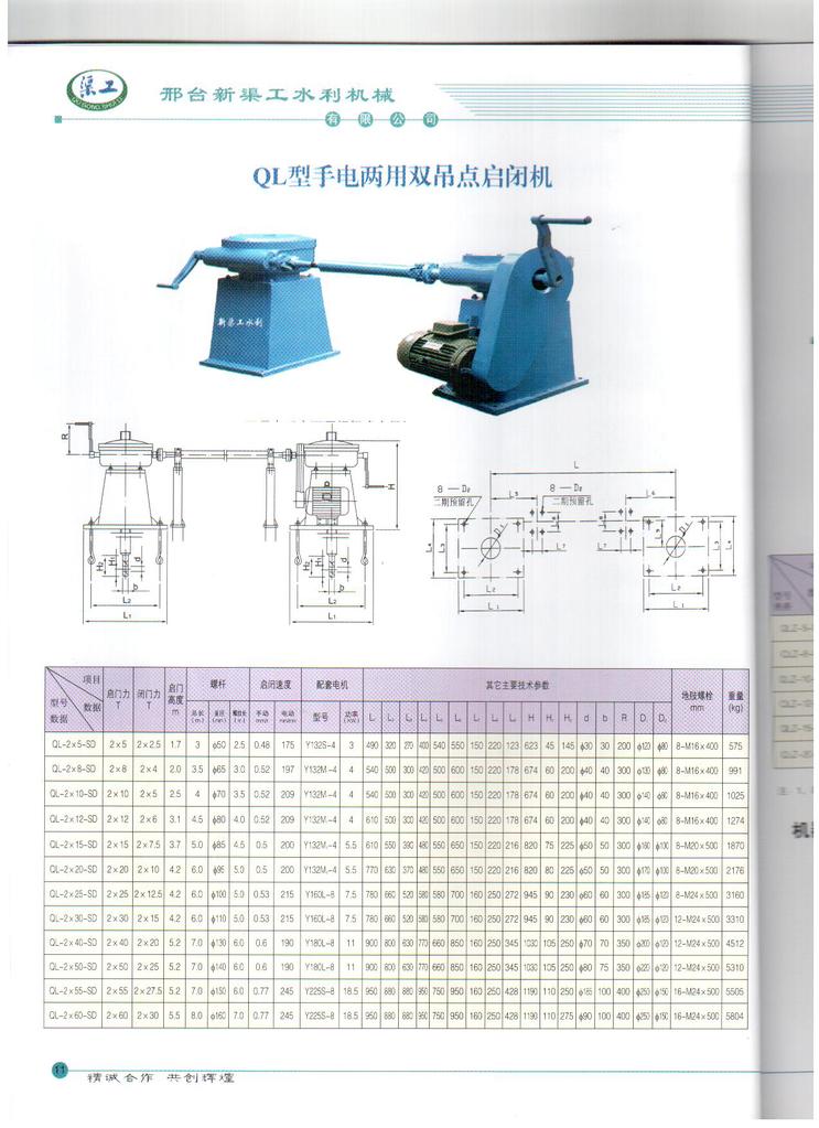(2)QPQ、QPK、QPG、QH型卷扬式启闭机系列,并有单吊点、双吊点和配有电驱动移动式,根据用户要求加手摇设置,产品吨位为:6T-125T可与平板、弧形闸门配套使用。
