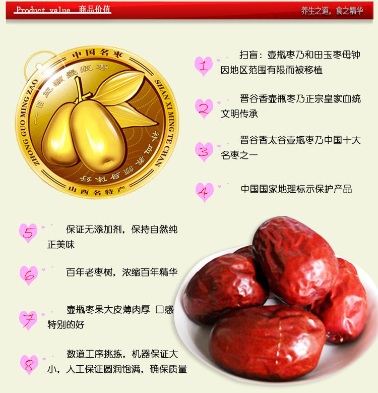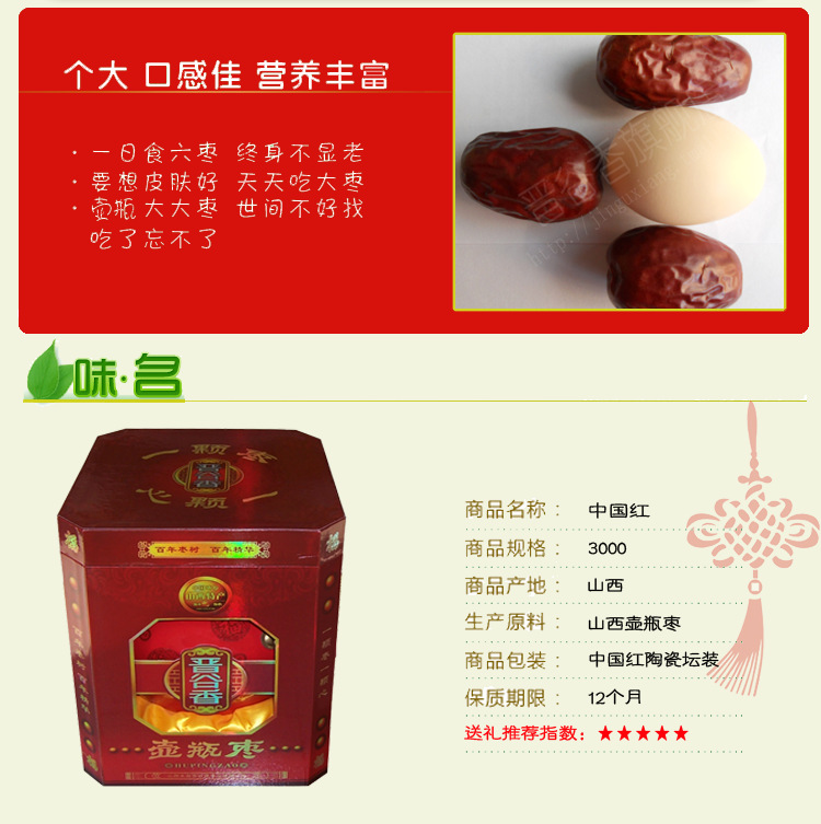 【产品特点】甘甜可口、价格一般,适合工薪消费或长期消费。不要看它小,小的也是极品味道,三级枣通常都是老树枣,味道非常的甜,有的枣核都没有。许多老顾客都吃过我们的赠品,然后慕名而来,绝对的美味,超高性价。常年可以全家分享的好枣。