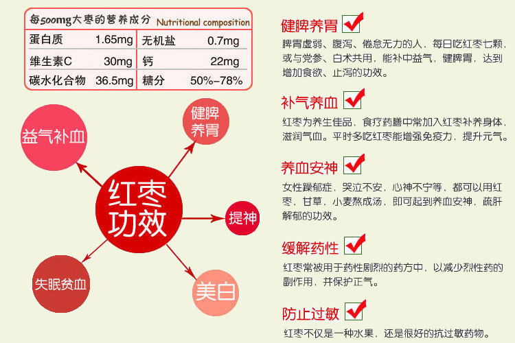 人们历来就把红枣视为极佳的滋补品。红枣不但是美味果品,还是滋补良药,有强筋壮骨、补血行气、滋颐润颜之功效。红枣能作为药用,早在《本草备要》中就有记述。说红枣能“补气益中,滋脾土,润心肺,调营养,缓阴血,生津液。枣可用于清血液降血脂、调血压、贫血、肺虚咳嗽、神经衰弱、失眠等。