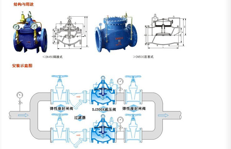 【200X减压阀产品概述】200X减压阀,是一种利用自身能量来调节与控制管路压力的智能阀门。200X减压阀用于生活给水、消防给水及其其他工业给水系统,通过调节减压导阀,即可调节主阀的出口压力。出口压力不因进口压力、进口流量的变化而变化,安全可靠地将出口压力维持在设定值上,并可根据需要调节设定值以达到减压目的。该阀减压精确、性能稳定、安全可靠、安装调节方便,使用寿命长。 【200X减压阀工作原理】200X水力控制阀就是水压控制的阀门,水力控制阀由一个主阀及其附设的导管﹑导阀﹑针阀﹑球阀和压力表等组成。根据使用目的﹑功能及场所的不同可演变成遥控浮球阀﹑减压阀﹑缓闭止回阀﹑流量控制阀﹑泄压阀﹑水力电动控制阀、水泵控制阀、压差旁通阀、紧急关闭阀、液力自动阀等。 200X减压阀前要安装过滤器,并应便于排污的要求。水利控制阀是一种利用水自润式阀体,无须另加机油润滑,如遇主阀内零部件损坏时,请按下列指示进行拆卸,但在工程中应用水力控制阀时,还存在一定误区,如阀的适用条件,阀的设计选用要求,安装要点等,为此,本文拟以 CECS 标准《水力控制阀应用设计规程》为基础,结合本人的体会来阐述上述诸方面的问题。 【200X减压阀水力(水利)控制阀设计选用要点】:( 1 )工程式中应用的水力控制阀是经过制造厂检验合格,各种标识齐全,技术资料符合要求的产品。( 2 )根据功能要求,选择阀门种类,再根据管道输送介质、温度、建筑标准和业主 要要求 等,确定阀门的阀体和密封部位的材质。常用的阀体材料有铸铁 、铜铁、铜、塑料等。常用的密封面和衬里材料有铜合金、塑料、钢、硬质合金、橡胶等。阀体材料应与管道材料相匹配。( 3 )阀门的公称压力有0.6、1.0、1.6、2.5和4.0MPa等不同级别,管道输送的介质,其工作压力应小于阀门的公称压力值。( 4 )工程中水力控制阀的设置应当有足够的空间,以便管理、操作、安装和维修,并应符合管路对阀门的要求。( 5 )管路采用法兰连接时,应采用法兰连接的水力控制阀;管路采用沟槽式连接时,应采用沟槽式连接的水力控制阀。( 6 )水利控制阀应设置在介质单向流动的管路上。( 7 )水利控制阀主阀体上的箭头方向必须与管路系统流向一致。( 8 )接水力控制阀管段不 应有气堵 、气阻现象。在管网最高位置 等存气段 应设置自动排气阀。( 9 )阀门水平安装时,阀盖、阀杆应朝上。垂直安装时,阀盖、阀杆应朝外。( 10)阀门安装前应做强度和严密性试验。( 11)阀门的强度和严密性试验应符合以下规定。 A、阀门的强度试验压力为公称压力的1.5倍; B、阀门的严密性试验压力为公称压力的1.5倍; C、试验压力在试验持续时间内应保持不变,且壳体填料及阀瓣密封面无渗漏。