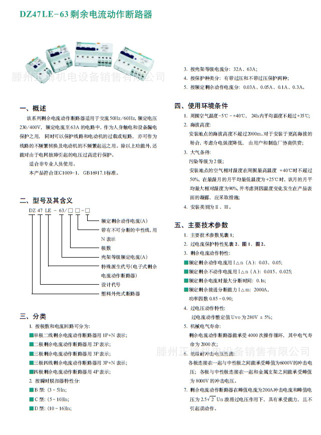 该系列剩余电流动作断路器适用于交流50Hz/60Hz,额定电压230/400V,额定电流至63A的电路中, 作为人身触电和设备漏电保护之用,同时可以保护线路和电动机的过载或短路, 亦可作为线路的不频繁