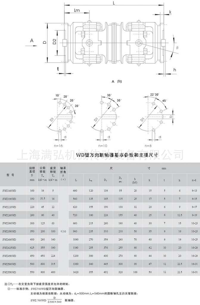 SWZ型用于轧钢机械,起重运输机械以及其他重型机械,连接两个同轴线传动轴系的SWZ型万向联轴器。其回转直径为160--550mm;传递公称转矩为18--800KN.m;轴线折角为10度,我公司是一家集机械传动设计、制造、销售于一体的专业公司。主要产品为十字万向联轴器,胀紧套、膜片联轴器、 星型联轴器,梅花联轴器、 弹性柱销联轴器、 鼓型齿式联轴器、蛇形弹簧联轴器、十字万向联轴器和滚子链联轴器;扭矩限制器;(包括标准件和非标准件)同步轮等.……公司位于上海市宝山杨行经济开发区, 本公司拥有国人一流的生产制造设备和先进的检测手段,并有一支高素质的职工队伍。
