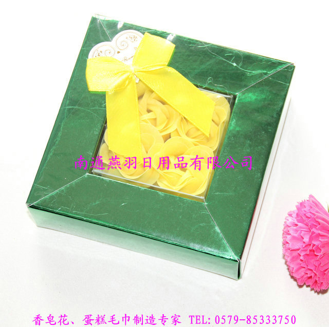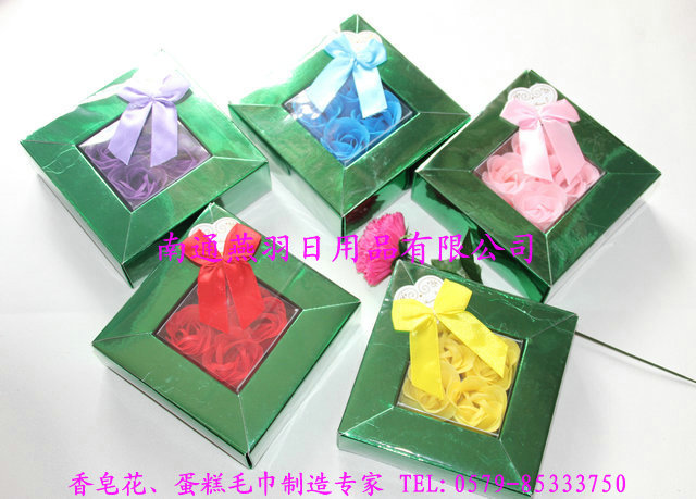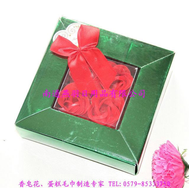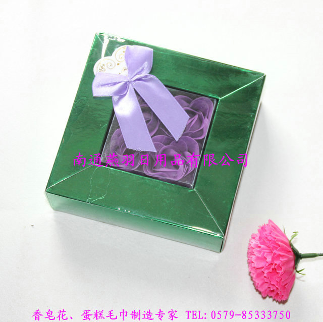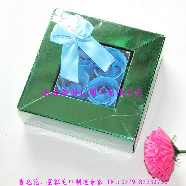 包装:正方形亮光纸盒+PVC内盒+蝴蝶结+覆膜