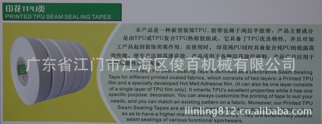 热封胶带是利用专用设备(压胶机或热压机)加热,缝合在雨衣、帐篷等防水、防气系列产品的针织骨位处,达到密封(防漏水、防漏气)效果的一种胶带。其广泛用于风雨衣、滑雪衣、营幕、帐篷、摩托车雨衣、潜水服、防水鞋、防水袋等防水系列产品和太空服、升空气球、防化服等防气系列产品。热封胶带具有强大的粘性和耐久的防水性,并且拥有很强的适应性。热封胶带可以与不同的材料取得最坚固可靠的固连,并提供耐久的防水密封。产品适用于防寒服、滑雪服、帐篷、雨衣、防护服、防水鞋、羽绒服、航海服、潜水服、车船罩等相关防水系列用品。是广大防水、防雨制品厂、服装厂、鞋厂的首选产品。 |
