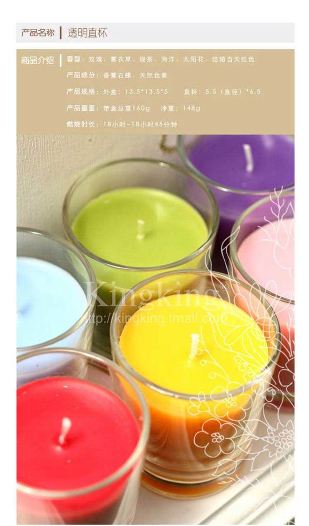 产品成分:香薰石蜡、玫瑰精华油、天然色素 产品规格:5.5cm*6.5cm (杯蜡) 产品外盒:20*7*7㎝(长*宽*高) 产品克重:554g 燃烧时长: 产品用途:馈赠亲友、放在家中、办公室等公共场所用以去除异味、净化空气,美化装扮家居环境。 1、蜡烛按形状可分为:pillar、taper、votive、tealight、Floating candle、异形蜡等。 2、蜡烛按材料可分为:石蜡、植物蜡、果冻蜡、动物蜡、矿物蜡、合成蜡等。 3、蜡烛按成形方式可分为:浇注蜡、压粉蜡、挤压蜡、灌装蜡等。 4、蜡烛按后加工方式可分为:彩绘、刮纹(拉丝)、贴纸、转印、lacker、电镀、雕刻、贴片蜡等。 |