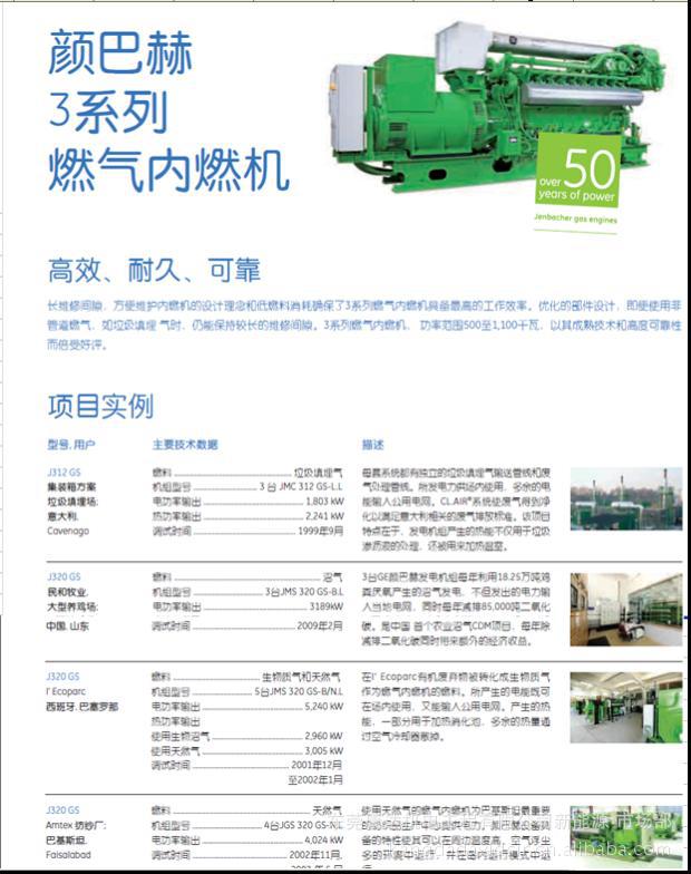 GE Jenbacher(颜巴赫)的燃气发动机与发电机组占有率达到40%以上,特殊气体的发动机与发电机组占有率更高达80%。它已经为全世界提供了数以万计的各种规格的燃气发动机,获得了全球客户的普遍好评,2007年底全球累计装机容量已达4GW。