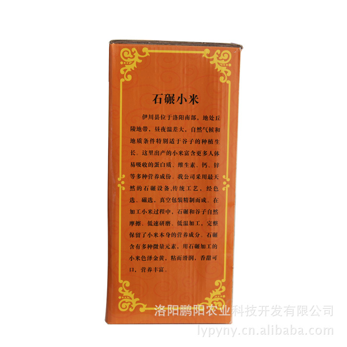 伊川县位于洛阳南部,地处丘陵地带,昼夜温差大,自然气候和地质条件特别适于谷子的种植生长。这里出产的小米富含更多人体易吸收的蛋白质、维生素、钙、锌等多种营养成份。我公司采用最天然的石碾设备,经筛选、碾磨、磁选、风选、色选等工艺,真空包装精制而成。在加小米过程中,石碾和谷子自然摩擦、低速研磨、低温加工,完整保留了小米本身的营养成分。石碾含有的多种微量元素,用石碾加工的小米色泽金黄,粘而滑润,香甜可口,营养丰富。