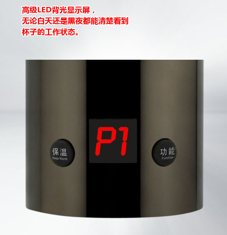 便利:操控面板在杯体的中上部,容易操作,有夜光显示功能,能在黑暗的状态下知道杯子在哪个位置,也能要据不同灯光知道杯子的工作状态