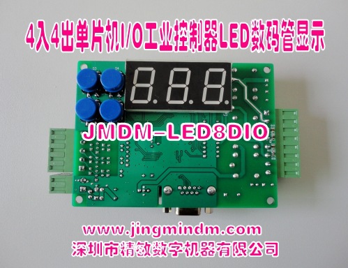 JMDM-LED8DIOMT(JMDM-LED8DIOV6)是深圳市精敏数字机器有限公司自主研发的一款具有四路光电隔离数字量信号输入,四路晶体管输出,四个手动按键调节,并带有数码管显示和蜂鸣器报警的高可靠稳定性的工业单片机控制器,也叫可显示和调整参数的8点单片机I/O工控板。