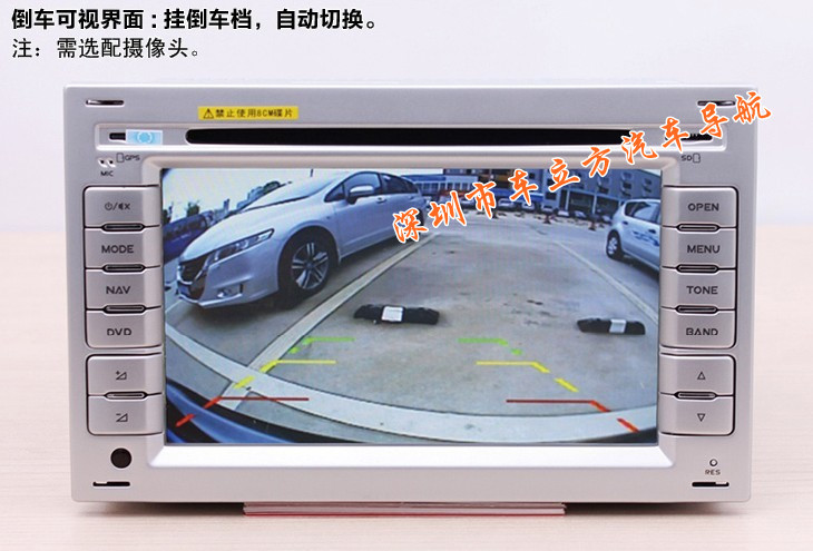 6、支持后视镜输入--选配,将连接到主机后视视频输入口即可,倒车时实时观察车后状况,当司机挂倒档后,画面会自动切 换 至倒车界面切换速度不到一秒,安全便捷