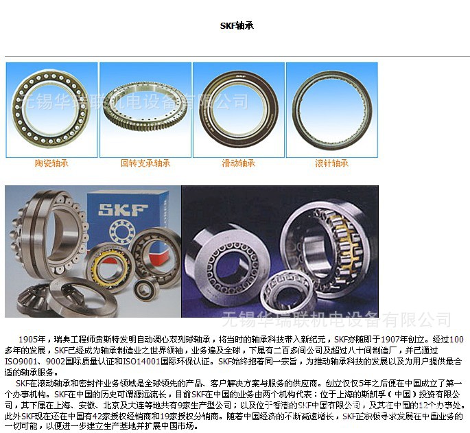 无锡华瑞联机电设备有限公司是瑞典SKF公司授权经销商,致力于SKF轴承在中国市场的销售和推广,是一家专业销售进口轴承的经销商,公司专业销售瑞典SKF轴承,同时销售日本NSK、德国FAG/INA、日本NTN、以及美国TIMKEN轴承等各种世界品牌的进口轴承以及国内生产的哈尔滨(HRB)轴承,瓦房店(ZWZ)轴承,洛阳(LYC)轴承等各种知名品牌的轴承。公司同时销售各种进口润滑脂(油)、进口皮带、轴承检测工具。