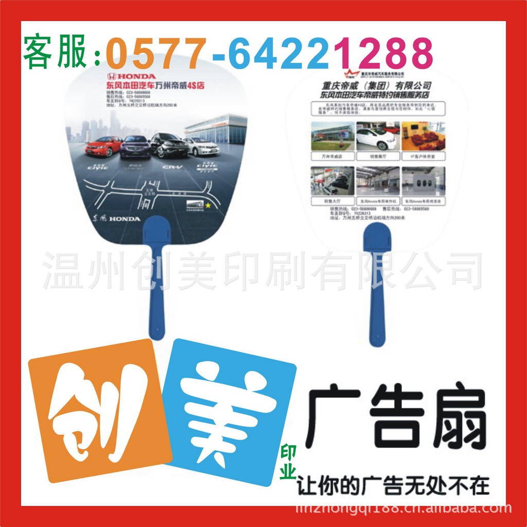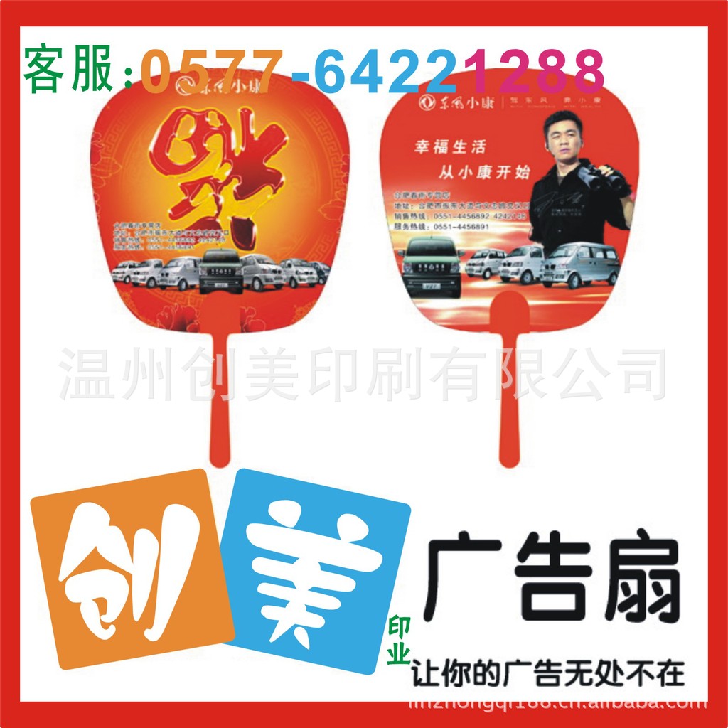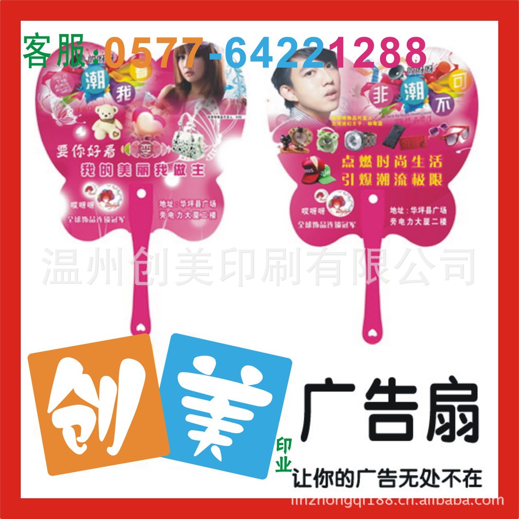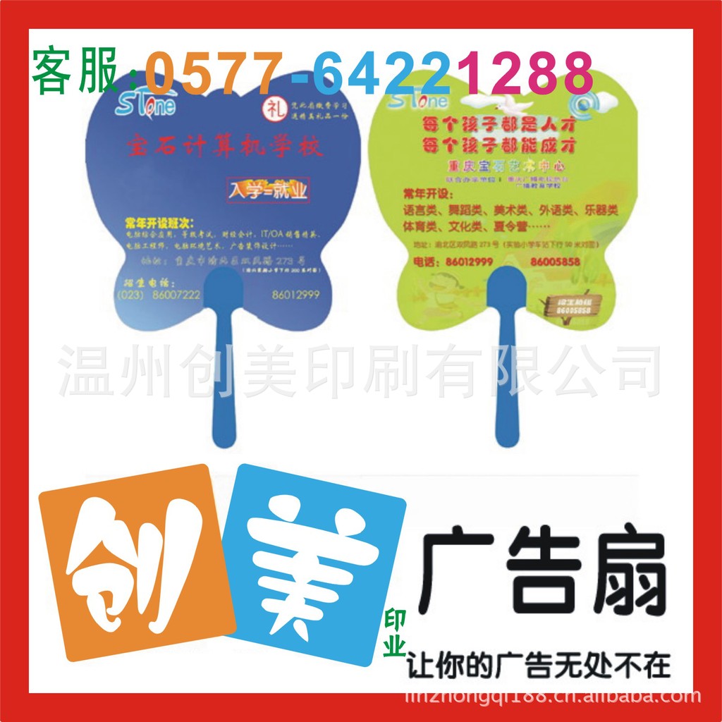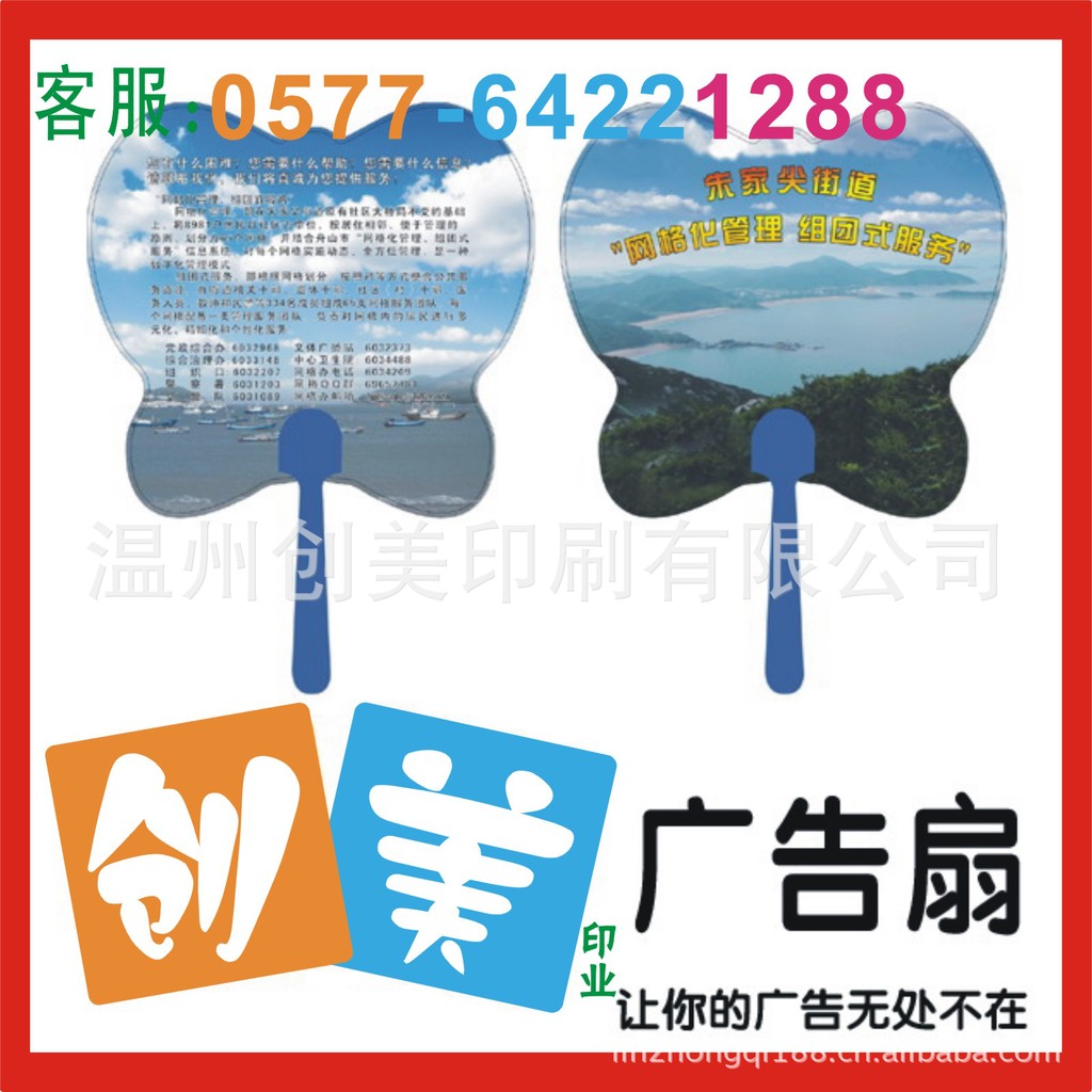 材质: PP广告扇塑料乳白 厚度 60丝 规格: 报价单规格以正常计算,如规格不一样与 我们联系核实价格手柄外形: 按客户要求定做 手柄颜色: 手柄通用颜色:蓝、红、黄、绿、黑、白 扇面外形 方形.圆形.半形.椭圆.异形 印刷: 双面四色印刷 扇面通用规格 17*17cm