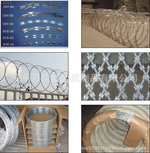 刀片刺绳按照安装方法不同可分为:(蛇腹式) 螺旋式刀片刺绳,直线型刀片刺绳,平板式刀片刺绳,刀片刺绳焊接网等。 片刺绳按照安装方法不同可分为:(蛇腹式) 螺旋式刀片刺绳,直线型刀片刺绳,平板式刀片刺绳,刀片刺绳焊接网等。刀片刺绳大略分为螺旋型、直线型、螺旋交叉型三种形式。