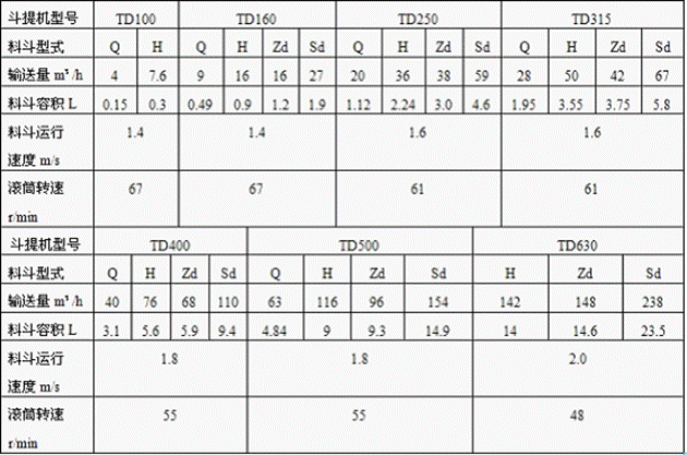 本机共有:TD100、TD1600、TD250、TD315、TD400、TD500、TD630等7种规格。本机的输送能力为4-238m³/h,高度约在4-40m范围内。为满足各种不同的使用要求,本机备有四种料斗制法:Q型(浅斗)、H型(弧底斗)、ZD型(中深斗)和SD型(深斗);传动装置法有左装和右装。