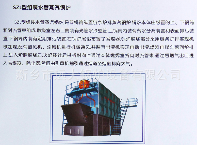 SZL系列水管组装蒸汽锅炉系双锅筒纵向布置水管式自然循环蒸汽锅炉,锅炉在厂内组装成上部受热和下部燃烧设备二大部件出厂。