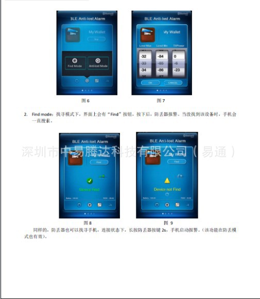 - Find mode:找寻模式下,界面上会有“Find”按钮,按下后,防丢器报警。当没找到该设备时,手机会一直搜索。