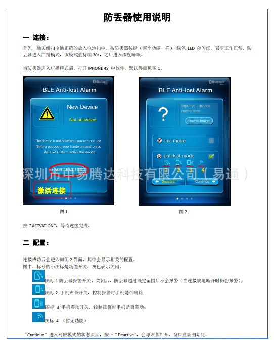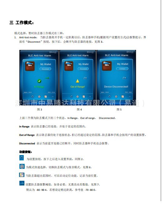 图标1防丢器报警开关,关闭后,防丢器超过既定范围后不会报警(当连接被迫断开时仍会报警);