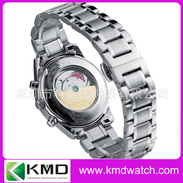 材 质:不锈钢表壳,30米防水结构,真皮表带,国产全自动机械机芯。表面如图。不锈钢加透