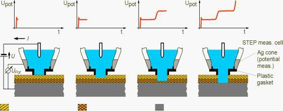14、 分步测量多层镍厚度 : 是一种已定型很久的测试方法,用来测定多层镍镀层系统中各个单个的镀层厚度以及各镀层之间的电化学电位差。在电镀工业中,对多层镍的测量变得越来越重要了,例如双层镍的测量已成为一种标准的操作。测试原理如下图: