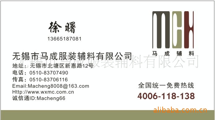无锡市马成服装辅料有限公司,是一家具有现代化气息的新型的服装辅料公司 ,本公司为一家专业定做各种标牌,印花,压花的公司。公司拥有一流的生产设备,经验丰富的设计,研发人员。公司自2004年成立以来坚持 "信誉为上,质量第一!"的公司精神。通过众多高素质客户对我们的严格要求,使我们在服装辅料方面积累了许多经验,为我们日后发展打下了坚实基础。现在又与美国3M公司强强合作,成为华东区3M的总代理,公司从一开始拥有的的滴塑,高周波生产线,到现在又发展了矽利康,压花,印花等生产线....我公司是以生产和销售各种规格反光转印等反光材料和高周波商标,高频商标,高周波压印标,高频压印标,高频压花,高周波压特种印花等为主的企业。主要用于服装、鞋帽、箱包等,竭诚欢迎广大新老客户来样定做。