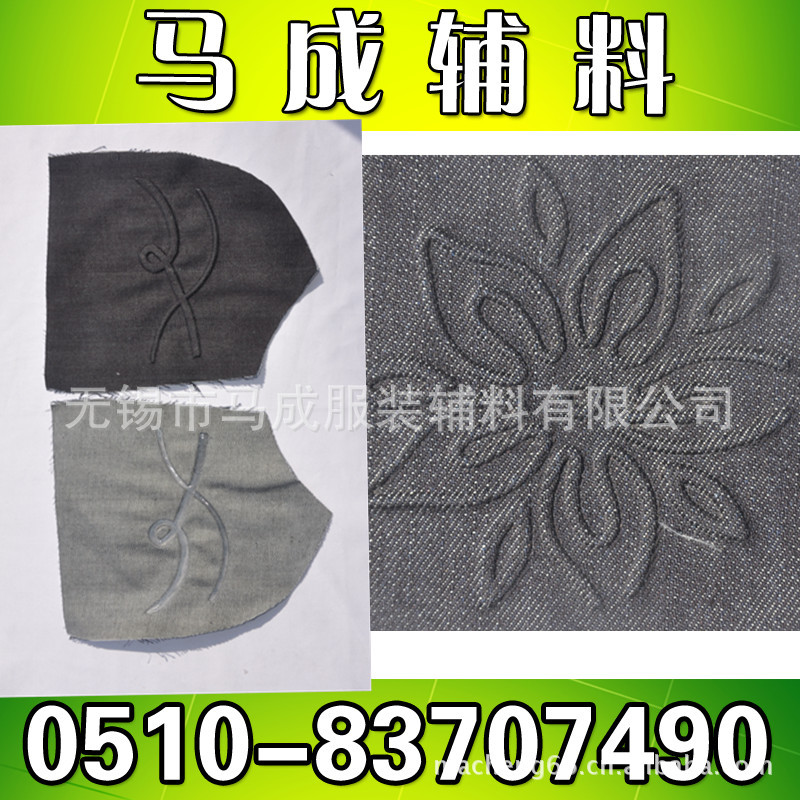 各种布料凹凸压花,牛仔压花工艺由上下模加热定型,成凹凸花纹,有较强的立体感,风格自然逼真。本公司近年来深加努力已研制出薄型化纤面料也能定型加工,而且其效果与牛仔布有着型感和手感明显不同之处。