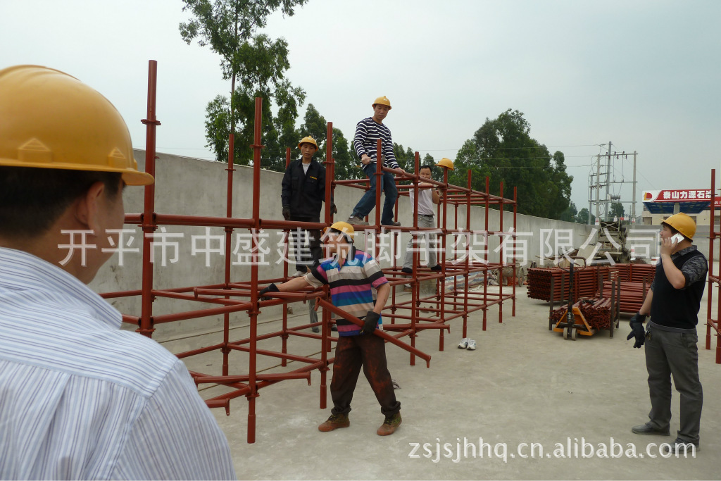 开平中盛建筑脚手架有限公司供应各种:脚手架(门式脚手架、钢支顶支撑架、雷亚架(舞台架)、菊花扣式脚手架、香蕉头式脚手架、碗扣式脚手架、轮扣式脚手架、等国内国外市场需要的脚手架及配件)和钢模板(国标钢模板、桥梁钢模板、异型钢模板及客户施工所需要的各自形状钢模板)。本公司采用先进设备进行加工。焊接工艺采用半自动系统焊接。产品质量保证可靠。表面处理可根据客户要求进行加工:油漆、喷粉、电镀、热镀锌。所有产品的配件齐全,规格型号齐备。欢迎来电订购或者来厂参观定货;