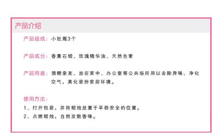 产品组成:香薰小台灯3只 产品成分:香薰石蜡、玫瑰精华油、天然色素 产品规格:外包装:25*8.5*9.5㎝ 单只:7(直径)*9㎝ 燃烧时长:24小时/个 产品用途:馈赠亲友、放在家中、办公室等公共场所用以去除异味、净化空气,美化装扮家居环境。 台灯上的精美贴片全部为手工制作,点燃蜡烛,盈盈烛光折射在灯罩的贴片上,五彩斑斓,犹如一个千变万化的万花筒。放在家中,既是一个优雅的装饰品又可以照明还可以清新空气,三个功能一步到位。 |