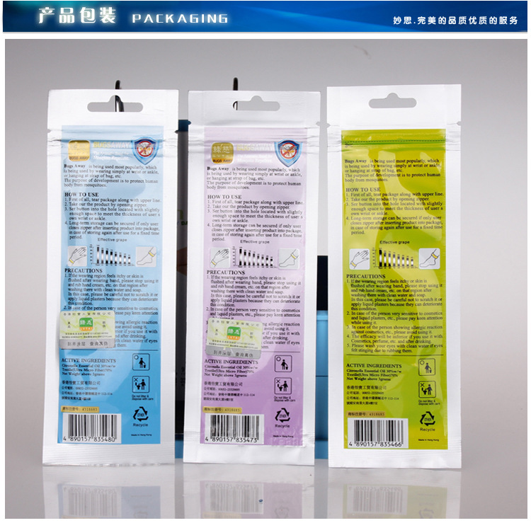 3、不要扔掉包装袋,因为我们的包装袋有独特的设计 防蚊手带不用时,可放回袋中,捏起袋子自封口保存,以备下次使用。