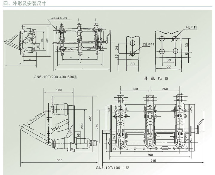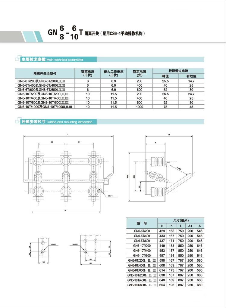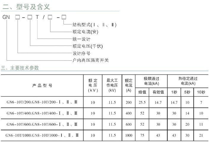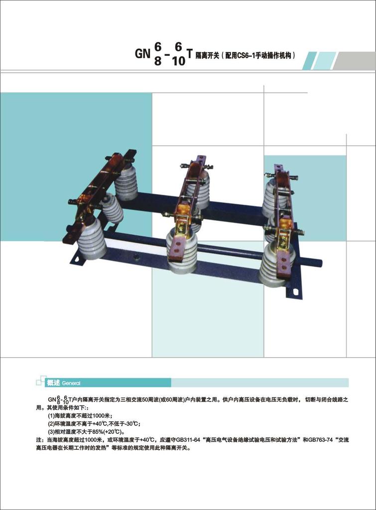 GN6,GN8系列户内高压隔离开关用于户内12kV三相交流50Hz的电力系统中,额定电流分别为630A,1000A,1250A,可用于GG-1A(F2)高压开关柜内,主触刀作为网络在有电压无负荷的情况下接通和转换线路之用;接地触刀可用于:当电气设备停电工作时,将接地触刀合闸,制造网络人工短路,保证检修人员得到可靠的“按地位”保护,作为免遭触电伤害的主要保护。