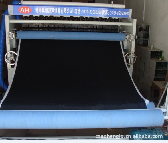 奥恒牌大功率超声波压花(压点)复合机(又称超声波无线绗缝机),是奥恒公司(0519-82060266)的另一主打产品。该机利用若干个超声波震动头并联形成1.5米甚至更长的长条形震动平面。当2-3层面料随着花辊的转动,到达这个长条形震动平面时,花辊圆柱面上高高突起的点、线花纹对这些面料同时进行挤压。面料受到挤压的地方,在超声波震动能量的作用下,不同面料的分子开始高速震荡,相互渗透,产生熔化、压合的效果。而当面料随着花辊的继续转动,逐渐远离这个长条形震动平面后,刚才熔化、压合的地方又快速冷却,固化定型,从而形成一种可以称作“无线绗缝,或压点复合”的特殊工艺效果。目前,这种超声波压花复合机正被日益广泛运用于:1.化纤面料、服装里布和喷胶棉的高速无线绗缝(压点绗缝);2. 无纺布与无纺布的压点贴合,制成有特殊功效的复合无纺布,如:空气过滤材料、防护服材料、包装材料、车罩复合布等;3. PE、PVC塑料薄膜与无纺布的压纹复合。这种复合布料可制作洗衣机罩,尿不湿床垫,桌布,防水包装布等。