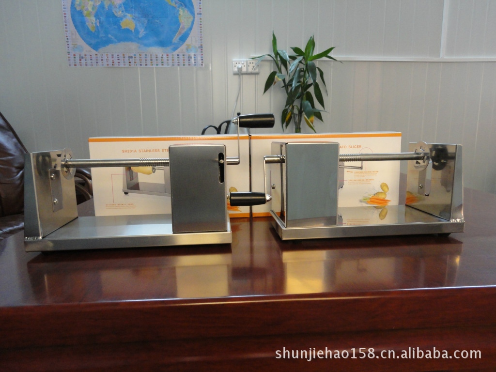 目前国内有手动型与电动机型薯塔机,由于其电动机型设计缺陷,工作效率极低,每分钟只能切割不到一个土豆,而且切割成品率仅为70%,也就是30%的土豆要切坏的,从而大大增加了成本,除此之外其结构较复杂,使用一段时间后就要出故障,返修调换带来诸多不便,误时误事。因此这种电动的机器已经被淘汰,而手动操作方便,简单快捷,是现在理想的致富好帮手。