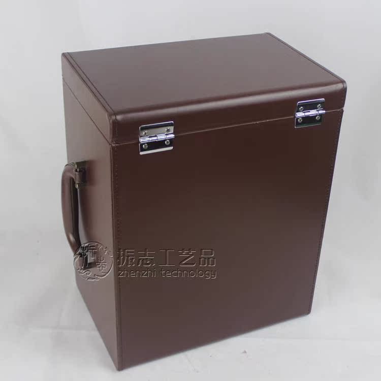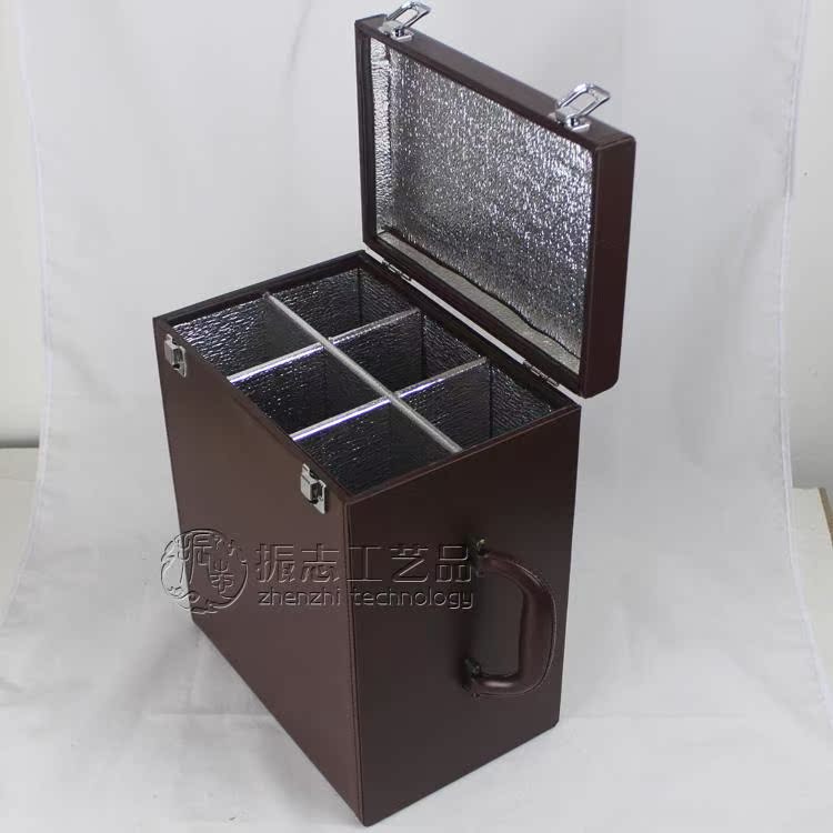 盒子款式:高档PU皮料,皮提手,黑色车线,盒子外径:约27.5x18.5x34.5(不含提手和锁扣)盒子内径:长度约26CM 宽度约17CM高度约:33CM适用范围:标准750ML红酒瓶盒子内里:保温层锡纸盒子净重:约3KG