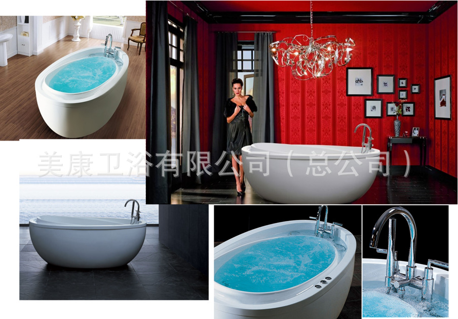 [材料]:采用4~6mm 亚克力板材,100%纯树脂,无碱纤维生产浴缸。配件采用摩特去水,热电镀钢板支架。