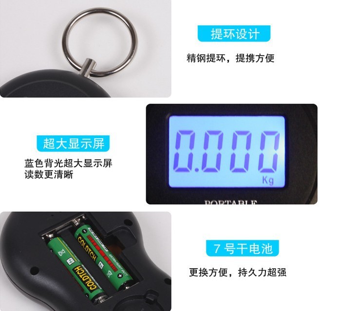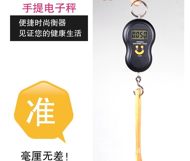 名称:葫芦型手提秤型号:NS-1自重:125g尺寸:11.5x7x2.5cm(秤体)液晶屏幕长:3.7cm单位:jin(斤)kg(公斤)、1b(磅)、oz(盎司),四种单位可任意切换配置:手提秤,2节7号电池说明:具有外观精巧,携带方便,称量准确,性能稳定可靠,性价比高等特点;具有去皮、零点跟踪、自动关机、单位置换等功能,是理想的新一代称量产品,便是淘宝卖家、快递必备的工具..开机:将电子秤悬挂,使其处于竖直状态,按“ON/OFF”键开机,显示窗显示(88888),蜂鸣器发出开机提示声,约二秒之后显示窗显示(0.00或0.000)此时手秤完成初始化,进入称重状态。去皮/置零:当使用容器装散装物品称重时,可先将容器置于秤上,按“TARE”键,待重量窗显示零后再装入物品称重,就可得到物品的净重值。称量:开机后,将物品挂于秤,即显示秤上物品重量值。当秤上吊挂物品稳定(停止摇摆)后,物品重量值被锁定,蜂鸣器发出锁定提示声并显示锁定标志(HOLD)。此时可按“ON/OFF”键解锁再次称量。称重时,所加物品重量(包括皮重)不得超过“最大称量+9d”(10kg: d=5g; 20kg: d=10g),如果超过以上值时,将显示超载标志“Err”,并发出报警声。单位转换:按“UNIT”键,电子秤在kg(公斤)、1b(磅)、oz(安士)三个单位之间进行轮流转换(1kg=2.21b=35oz)。关机:称重状态下(在初始化下不可关机),没有锁定时按“ON/OFF”键关机,锁定状态时先按“ON/OFF”键解锁,再按:“ON/OFF”键关机;或90秒内无任何操作,电子秤自动关机。注意事项:1.每次开机自检时,电子秤应处于竖直方向。2.请手提着吊环或在吊环上另加辅助工具称量,请勿手握外壳称量,否则将导致称量显示值误差超标。3.在使用过程中应尽量避免猛烈碰撞和冲击。4.电子吊秤外壳采用ABS工程塑料,清洁时请使用软布加清水或洗洁精擦拭,严禁使用苯、硝基类溶剂、烧碱液体等腐蚀性物质进行清洗。5.若显示电量不足标志( ),请及时更换电池。如果电子秤长期不使用,应取出电池,以免因电池漏液而损坏电路