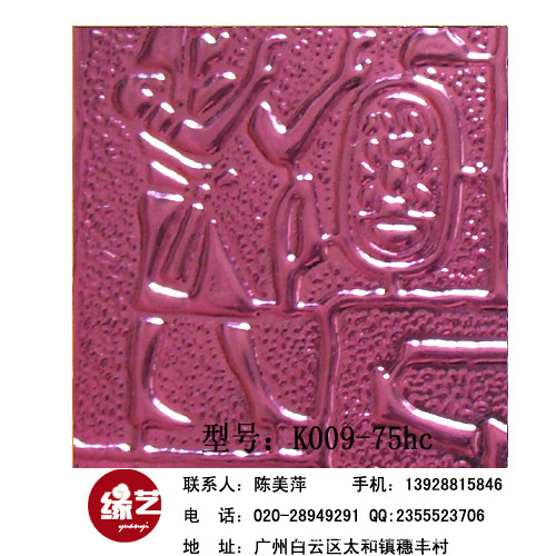 本厂专业生产经营PVC压纹软片,金属膜,橱柜防水材料,晶钢门贴膜,箱包面料,兼营PVC坐垫膜,金,银光膜以及墙壁、天花PVC门窗装潢材料。应用行业;可用低音炮贴膜材料 包装盒贴膜 画类贴膜 礼品包装膜 音箱膜 金银金属片 拉丝膜 PVC包膜 晶钢门贴膜 画框PVC贴膜 装饰贴膜 橱柜防水铝箔 等。